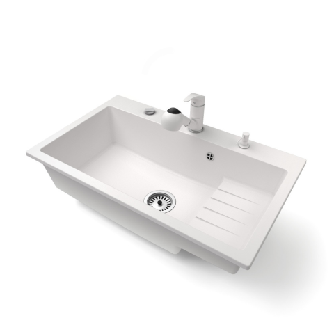 1 kép Nero Gránit mosogatótálca NERO Boss + kihúzható Shower csaptelep + adagoló + dugókiemelő (fehér)