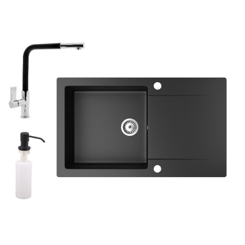 Nero Gránit mosogatótálca NERO Gold + kihúzható Linea csaptelep + adagoló (matt fekete)