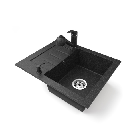 1 kép Nero Gránit mosogatótálca NERO Monza + kihúzható zuhanyfejes Shower csaptelep + adagoló (fekete)