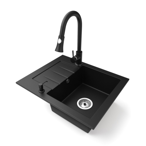1 kép Nero Gránit mosogatótálca NERO Monza + kihúzható zuhanyfejes Snake csaptelep + adagoló (matt fekete)