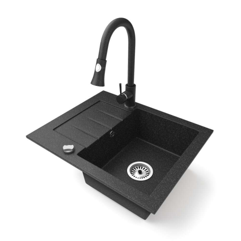 1 kép Nero Gránit mosogatótálca NERO Monza + kihúzható zuhanyfejes Snake csaptelep + dugókiemelő (fekete)