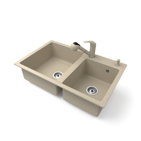 NERO Palazzo gránit mosogatótálca homokbézs színben csapteleppel és adagolóval. A kétmedencés mosogatótálcák 21. századi csúcsmodellje, ami két nagyméretű medencéjével és különleges kialakításával minden konyha tökéletes eleme lehet. Az asszimetrikus kial