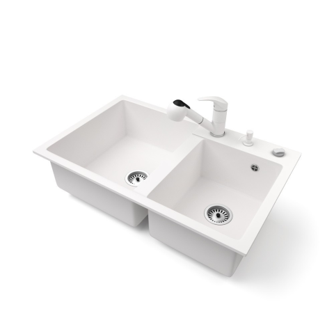 1 kép Nero Gránit mosogatótálca NERO Palazzo + kihúzható zuhanyfejes Shower csaptelep + adagoló + dugókiemelő (fehér)