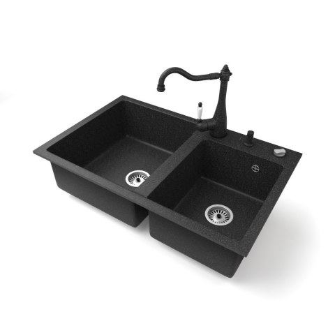 1 kép Nero Gránit mosogatótálca NERO Palazzo + Retro csaptelep + adagoló + dugókiemelő (fekete)