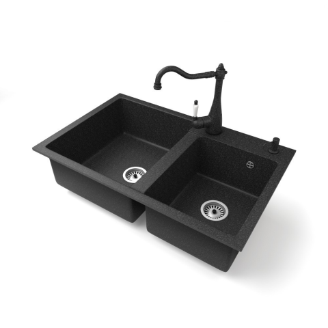 1 kép Nero Gránit mosogatótálca NERO Palazzo + Retro csaptelep + adagoló (fekete)