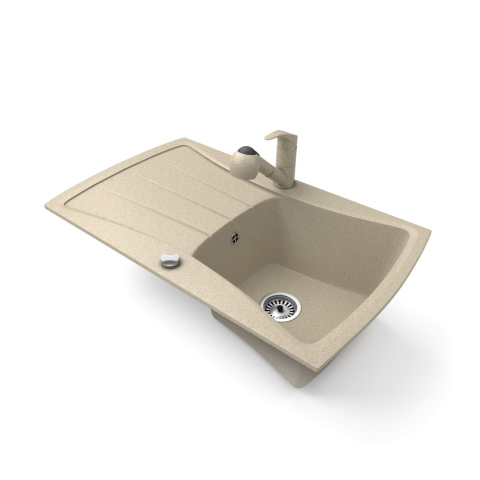 NERO Venezia gránit mosogató homokbézs színben. Egyedi és különleges formával tervezett egymedencés mosogató, kellően nagyméretű csepegtető résszel. A velencei gondolákat idéző, harmonikusan kialakított ívekkel a konyha esztétikus része, emellett anyagvas