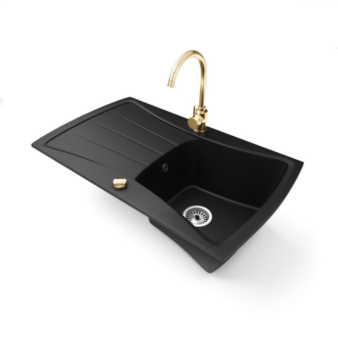 Nero Gránit mosogatótálca NERO Venezia + magasított arany csaptelep + dugókiemelő (matt fekete) mosogatótálca termékleírás