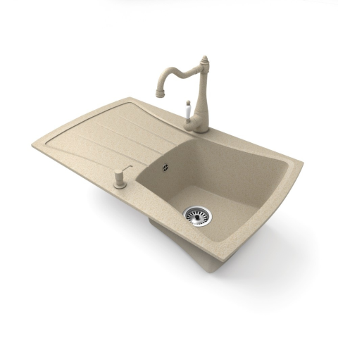 NERO Venezia gránit mosogató homokbézs színben. Egyedi és különleges formával tervezett egymedencés mosogató, kellően nagyméretű csepegtető résszel. A velencei gondolákat idéző, harmonikusan kialakított ívekkel a konyha esztétikus része, emellett anyagvas