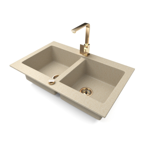 1 kép Nero Gránit mosogatótálca NERO Verso + Design Gold csaptelep + dugókiemelő (bézs)