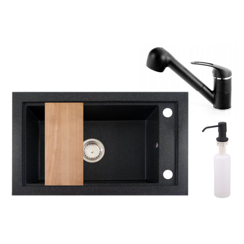 1 kép Nero Panama P686-427C Gránit Mosogató + Kihúzható Shower Csaptelep + Deszka + Adagoló (szemcsés fekete)