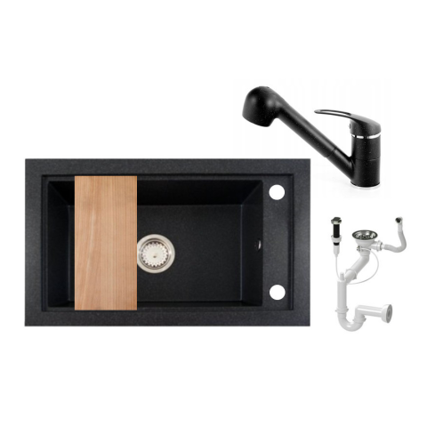 1 kép Nero Panama P686-427C Gránit Mosogató + Kihúzható Shower Csaptelep + Deszka + Dugóemelő (szemcsés fekete)