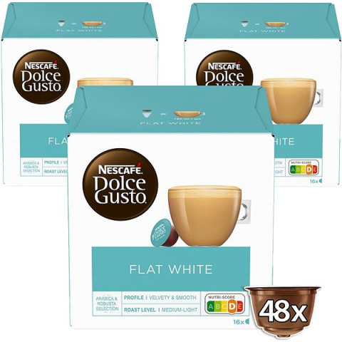 Kávékapszula Dolce Gusto kompatibilis - flat white, kávékeverék, 48 kapszulát tartalmaz Dolce Gusto® Flat White - erős espresso tejjel lágyítvaÉlvezd a bársonyos italt, amelyet az ausztrál és új-zélandi baristák hoztak létre azáltal, hogy ügyesen öntöttek egy kis tejet az erős eszpresszó