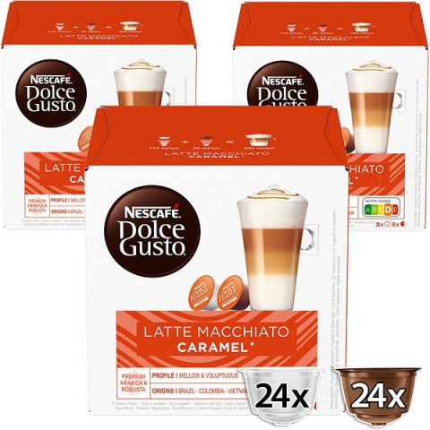 Kávékapszula Dolce Gusto kompatibilis - latte macchiato, 100% arabica, medium intenzitás, karamellás aroma, származási helye Dél-Amerika, műanyag anyagú kapszula, 24 kapszulát tartalmaz Fedezd fel a NESCAFÉ® Dolce Gusto® Caramel Macchiato-tNe habozz, próbáld ki a NESCAFÉ® Dolce Gusto® ikonikus három színű italát - a Caramel Macchiato-t. Ez a finom ital forró tejből, finom minőségű ká
