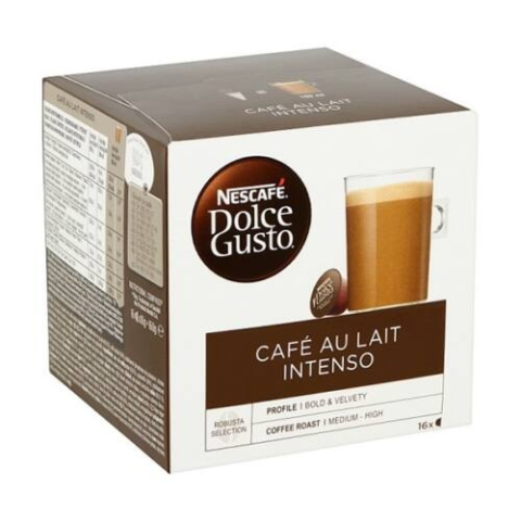Nescafé Dolce Gusto Café au Lait Intenso tejes kávékapszula. 16 db/16 csésze. Súly: 160 g / kapszula. Összetevők: Teljes tejpor 64,2%; Azonnal oldódó kávé 34%; Stabilizátorok (kálium-foszfátok, nátrium-citrátok); Emulgeálószer (szójalecit).