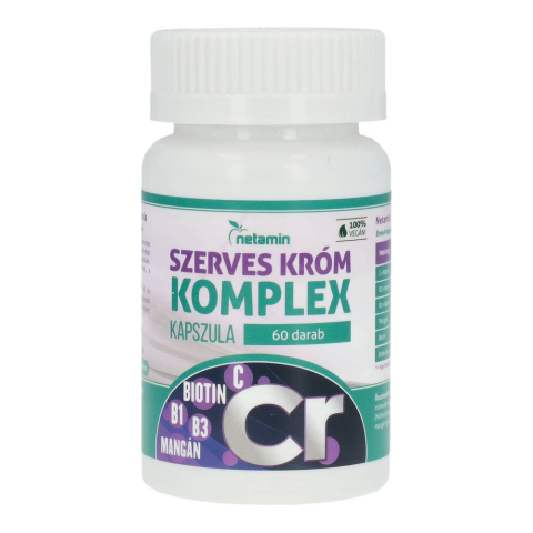 Netamin szerves króm komplex kapszula 60 db Szerves kötésű, kiválóan felszívódó és hasznosuló króm extra hatóanyagokkal: C-, B1-, B3-vitaminnal, biotinnal és szerves mangánnal a még hatékonyabb felszívódás, az egészséges vércukorszint és anyagcsere-fol