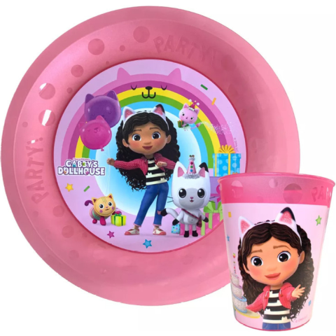 RAKTÁRRÓL AZONNAL! Gabby's Dollhouse, Gabi babaháza Friends micro prémium műanyag szett Csomagolás nélkül! A készlet tartalma: 1 db lapostányér (Mikrózható műanyag) 1 db pohár 250 ml (600 watton mikrózható max. 2 percig) A termék anyaga: műanyag.