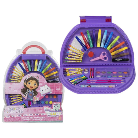 RAKTÁRRÓL AZONNAL! Gabby's Dollhouse, Gabi babaháza írószer szett 50 db-os Méret: 41x58 cm Tartalma: - 12 db vízfesték - 12 db filctoll - 12 db zsírkréta - 1 db ecset - 1 db keverőtálca - 2 db HB ceruza - 6 db színes ceruza - 1 db radír - 1 db faragó - 1