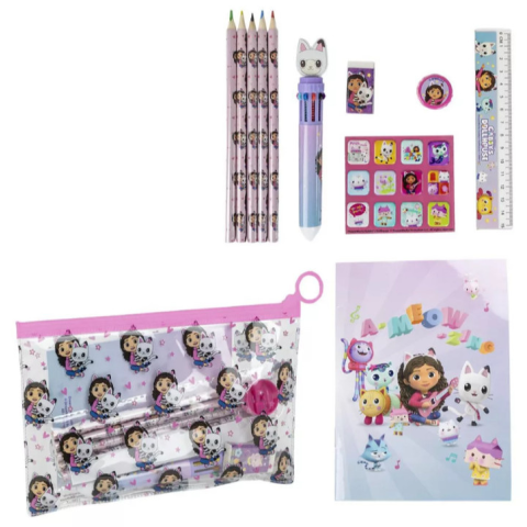 RAKTÁRRÓL AZONNAL! Gabby's Dollhouse, Gabi babaháza írószer szett Mérete: 22x14 cm Tartalma: - 1 db tolltartó (poliészter) - 1 db A6 notesz - 5 db színes ceruza - 1 db faragó - 1 db radír - 1 db vonalzó - 1 db 10 színű toll - matricák