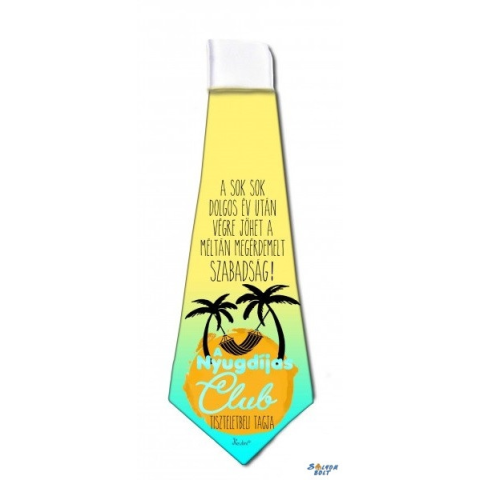 Nyakkendő, A nyugdíjas klub tiszteletbeli tagja Nyomott mintás, gumis, nyakba akasztható. Mérete: 37 cm x 13 cm Anyaga: poliészter Nyugdíjas búcsúztató ajándék