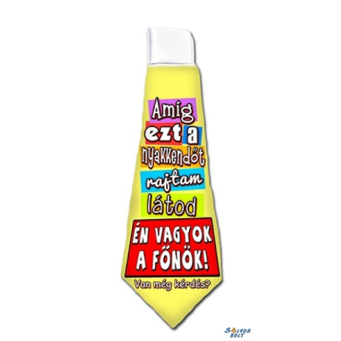 Nyakkendő, Amíg ezt a nyakkendőt rajtam látod, én vagyok a főnök Nyomott mintás, gumis, nyakba akasztható. Mérete: 37 cm x 13 cm Anyaga: poliészter
