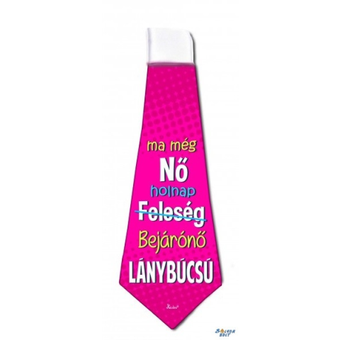 Nyakkendő, Lánybúcsú, Ma még nő, holnap bejárónő Nyomott mintás, gumis, nyakba akasztható. Mérete: 37 cm x 13 cm Anyaga: poliészter Vicces ajándék lánybúcsúra
