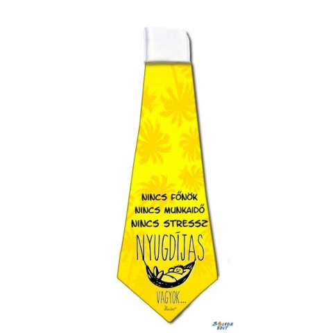 Nyakkendő, Nyugdíjas vagyok Nyomott mintás, gumis, nyakba akasztható. Mérete: 37 cm x 13 cm Anyaga: poliészter Nyugdíjas búcsúztató ajándék