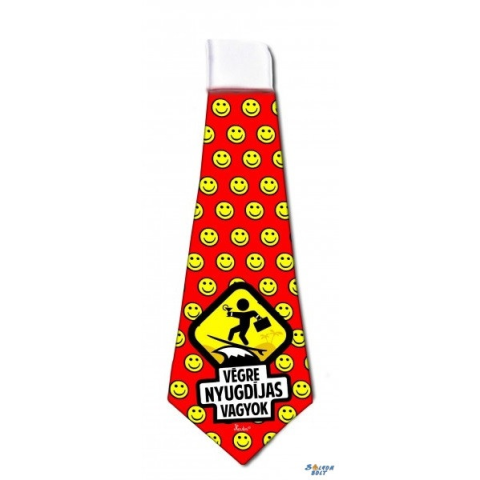 Nyakkendő, Végre nyugdíjas vagyok Nyomott mintás, gumis, nyakba akasztható. Mérete: 37 cm x 13 cm Anyaga: poliészter Nyugdíjas búcsúztató ajándék