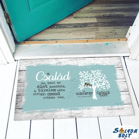 Nevlini Vicces színes lábtörlő, A család az, ahol az élet kezdődik lakástextília termékleírás