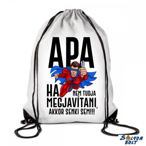 Vicces tornazsák, hátizsák, táska apukáknak Anyaga: polieszter, vízlepergető Mérete: 44 x 34 cm Ha apa nem tudja megjavítani, akkor senki sem!
