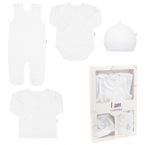Bájos 4 részes együttes babáknak New Baby I AM. Az együttes nagyon kellemes, puha és kiváló minőségű, csecsemők számára alkalmas anyagból készült, és nem csak újszülött osztályra alkalmas.Tartalma: teljes hosszában patentos, hosszú ujjú body, rugdalózó, f
