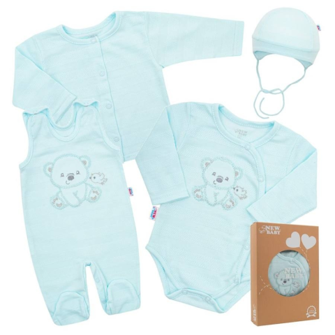 Baba 4-részes együttes Sweet Bear kisbabák számára. Az együttes nagyon jó minőségű kellemes és puha anyagból készült. Hosszú ujjú patentos bodyt, rugdalózót, kabátkát és sapkát tartalmaz. A body teljes hosszában patentos, aranyos maci és madárka képpel dí