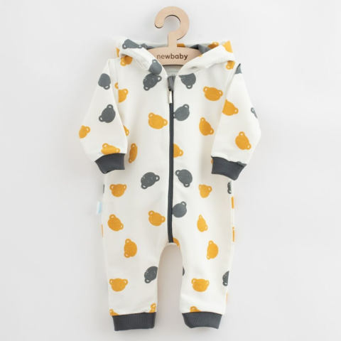 Bájos és praktikus kapucnis overall New Baby Little One márkától. Mackó mintával nyomott kezeslábas, teljes hosszában cipzárral, passzés ujjakkal és szárakkal. Bájos