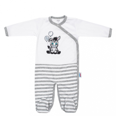 Baba kezeslábas New Baby Zebra exclusive kisbabák számára. A kezeslábas aranyos hímzett zebra képpel van díszítve és az alsó része csíkos. Teljes hosszában és az ülepénél patentos. A kollekció nagyon kellemes, puha és minőségi anyagból készült. Anyag: 100% pamut.