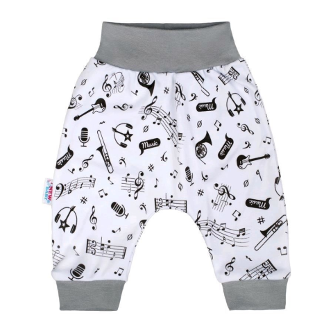 Eredeti, divatos pamut baba lábfejesnadrág New Baby Music. A lábfejesnadrág egyszínű, hangjegyekkel és hangszerekkel díszitve. Puha széles derékpántal, ami nem nyomja a baba hasát. Az üllepénél patentos, ami megkönnyíti a baba öltöztetését és pelenkázását
