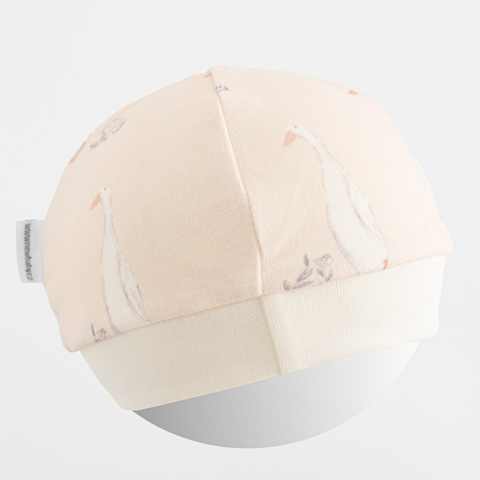 Szép pamut baba sapka New Baby Libák. Gyönyörű gyermekmotívum aranyos libákkal, kellemes a gyermek szemének, rugalmas szegéllyel, ami nem nyomja a baba fejét. Puha minőségi elasztikus, anyagból készült, amibe a baba kényelmesen fogja érezni magát. Anyaga: