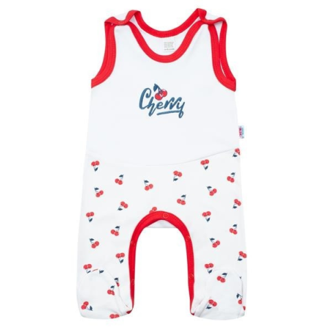 Gyönyörű New Baby Cherry pamut rugdalózó babáknak. A rugdalózót cseresznyés Cherry rátét díszíti. A rátét aláragasztása véd a karcolásoktól. Alsó része teljes felületén cseresznye mintás. Színes szegéllyel a nyakán és a vállán. Vállán és ülepén gombolássa