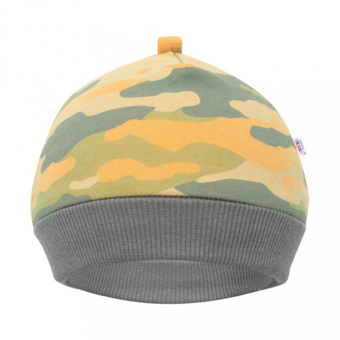 Stílusos baba sapka New Baby With Love kisbabák számára. A sapka terepmintás. Széles rugalmas szegéllyel rendelkezik, amely nem nyomja a baba fejét. Nagyon kellemes, puha és kiváló minőségű anyagból készült, amibe a baba nagyon kellemesen fogja érezni mag