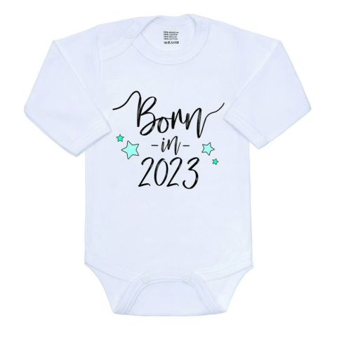 Eredeti pamut baba hosszú ujjú body New Baby felirattal Born in 2023. A nyomtatáshoz használt színek alkalmasak a babák számára. Puha minőségi anyagból készült, amibe a baba kényelmesen fogja érezni magát. Vállnál és az ülepénél patentos, ami megkönnyíti
