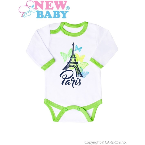 New Baby csecsemő hosszú ujjú body. A body Eiffel-toronnyal, pillangókkal és felírattal Paris díszitve. Vállnál és az üllepénél patentos ami megkönnyíti a baba öltöztetését és pelenkázását. Minőségi anyagaból készült. Méretei: mellbősége kb. 38 cm, telj