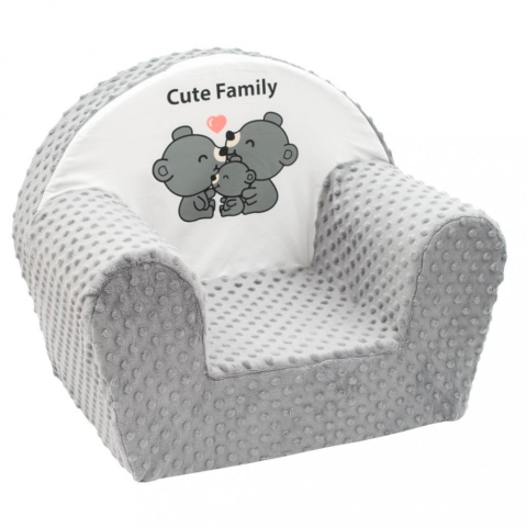 Gyerek Minky fotel New Baby Cute Family Pompás kiegészítő bútordarab a gyerekszobába. A gyerekek kényelmesen leülhetnek és megnézhetik a kedvenc meséjüket, rajzolhatnak vagy mesekönyvet lapozhatnak. Egy délutáni pihenésre is tökéletes. A fotel nagyon könn