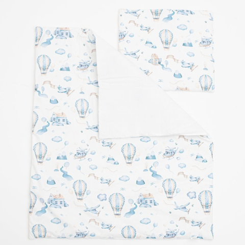 Gyönyörű New Baby Romance pamut szett babakocsiba. A szett egy párnát és egy paplant tartalmaz mesebeli felhős kalandok mintával. Antiallergén szál töltettel. A szett kiváló minőségű pamutból készült. A pamut szett fényűző módon, gyengéden simogatja és me