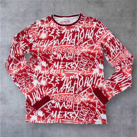 Karácsonyi feliratos pizsama felső Egyenes szabású, kerek nyakkivágású, uuja vége passzés. Szép állapotú.