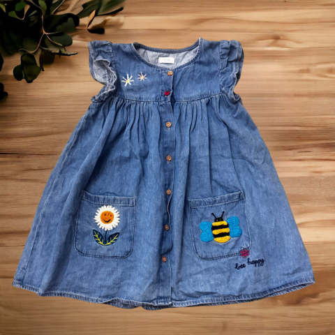 Eleje végig gombos, vállnál fodros, zsebeinél virággal és méhecskével. mell:2x32cm hossz:56cm Hibátlan állapotú.