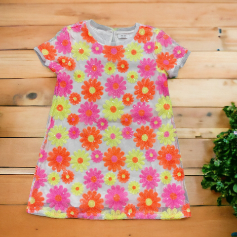 Nyaknál egy gombbal záródik, vidám színes flitter virágos anyag, belseje pamut. mell:2x33m hossz:58cm Újszerű.