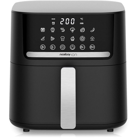 Airfryer - digitális vezérlés, 80 - 200 °C között szabályozható hőmérséklet, tapadásmentes felület, kijelző, túlmelegedés elleni védelem, időzítő, automatikus kikapcsolás, hőmérséklet szabályozás, késleltetett indítás, automatikus programok és szárítás, 12 program, kivehető edény, 1600 W teljesítmény, 6,5 l-es edény tapadásmentes felülettel, 1 fritőz kosár, tömege 3,8 kg, méretei 28 × 27,5 × 37 cm (ma × szé × mé), fekete kivitel Niceboy ION AirFr