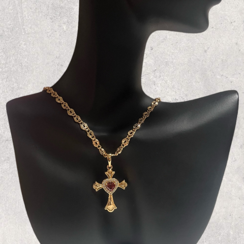 Antiallergén kereszt nyaklán piros kővel Nyaklánc hossz: 45 cm Szélesség: 4 mm Medál magasság: 35 mm Szélesség: 19 mm Szín: 18K