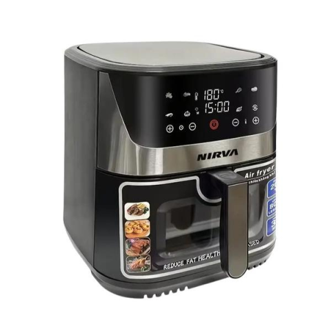 NIRVA 10 L családi méretű légkeveréses sütő YN1161676 A NIRVA 10 literes, európai szabványú érintőképernyős légkeveréses sütő ideális választás nagyobb családok számára. A modern digitális vezérlés egy gombnyomással kínál előre beállított programokat sültkrumpli, baromfi, húsok és halak elkészítéséhez.A rozsdamentes acél belső rész tartósságot és könnyű tisztíthatóságot biztosít, a tapadásmentes, mosogatógépben mosható tartozékok pedig ké