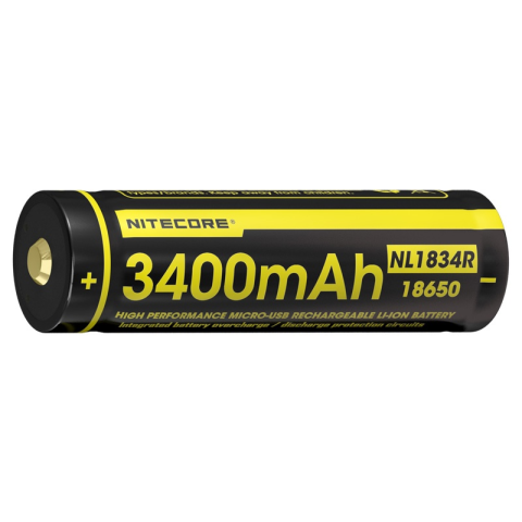 Nitecore 18650 3,6V 3400mAh USB-s akkumulátorAz NL1834R egy 3400mAh-ás Li-Ion akkumulátor, melyet integrált micro USB töltőporttal láttak el. A beépített áramkör megóvja a túltöltéstől és túlmerüléstől, valamint a hálózati túlfeszültségtől, a töltés á