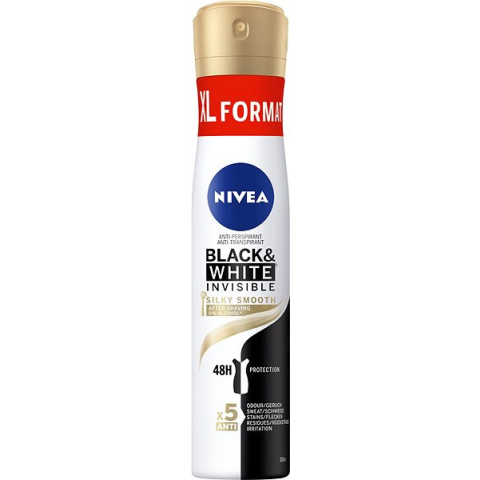 Izzadásgátló - női, spray, zsíros, normál, kombinált, száraz és érett bőrre ajánlott, védő, nem hagy foltot, alkoholmentes, 200 ml-es kiszerelés A Nivea Black & White Silky Smooth izzadásgátló megelőzi a fehér nyomok kialakulását a fekete ruhákon és a sárga foltok megjelenését a fehér ruhákon. Kivételesen kíméletes összetétele hatékony és