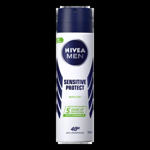 A NIVEA Men Sensitive Protect dezodor spray 150 ml kíméletes, mégis hatékony izzadásgátló, amely alkoholmentes formulájával óvja az érzékeny bőrt. Frissességet biztosít és megbízható védelmet nyújt a kellemetlen szagok ellen egész nap.